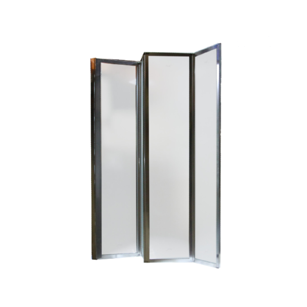 складные шторки из пластика или закалённого стекла. Шторки из закалённого стекла в отличие от пластика не темнеют со временем, а также отличаются прочностью и гигиеничностью. Стеклянная поверхность может быть прозрачной, матовой, тонированной, рифлёной и с рисунком. При выборе складных душевых шторок стоит обратить внимание на