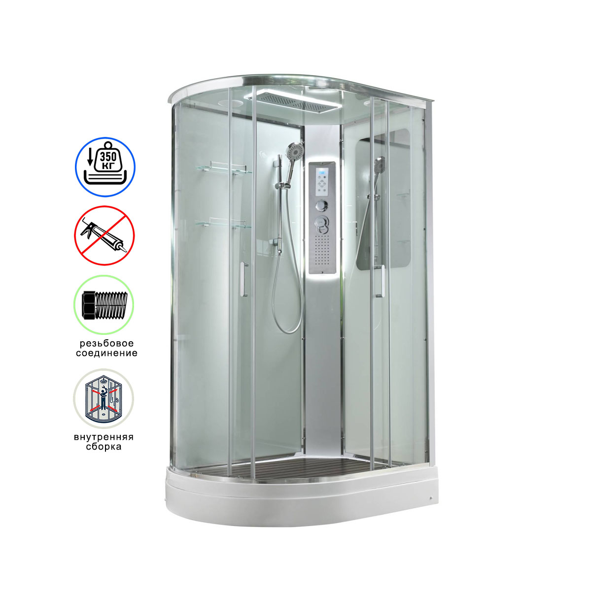 Стильная душевая кабина AvaCan сочетает в себе высокую функциональность, практичность и надежность. При изготовлении применяется безопасное закаленное стекло, надежно фиксируемое алюминиевым профилем.Профиль сделан из алюминия повышенной прочности. Сборка без силикона (увеличивает срок службы, защищает от протечек), внутренняя сборка (облегчает установку и ревизию; позволяет установить в ограниченном пространстве и обойтись без демонтажа других сантехнических приборов), смеситель резьбовой (без хомутов). Двойные металлические ролики дверей (распределение нагрузки на два ролика, увеличивают срок службы). Душевая штанга(позволяет регулировать по высоте ручную лейку), ручная арома-лейка с витамином С (картридж в комплекте,есть возможность замены или удаления картриджа), полочки(из стекла, с ограничителем), сифон с гидрозатвором, сенсорный пульт управления с функциями: блютуз, LED подсветка, радио, вытяжка, гидромассаж спины, тропический (верхний) душ.