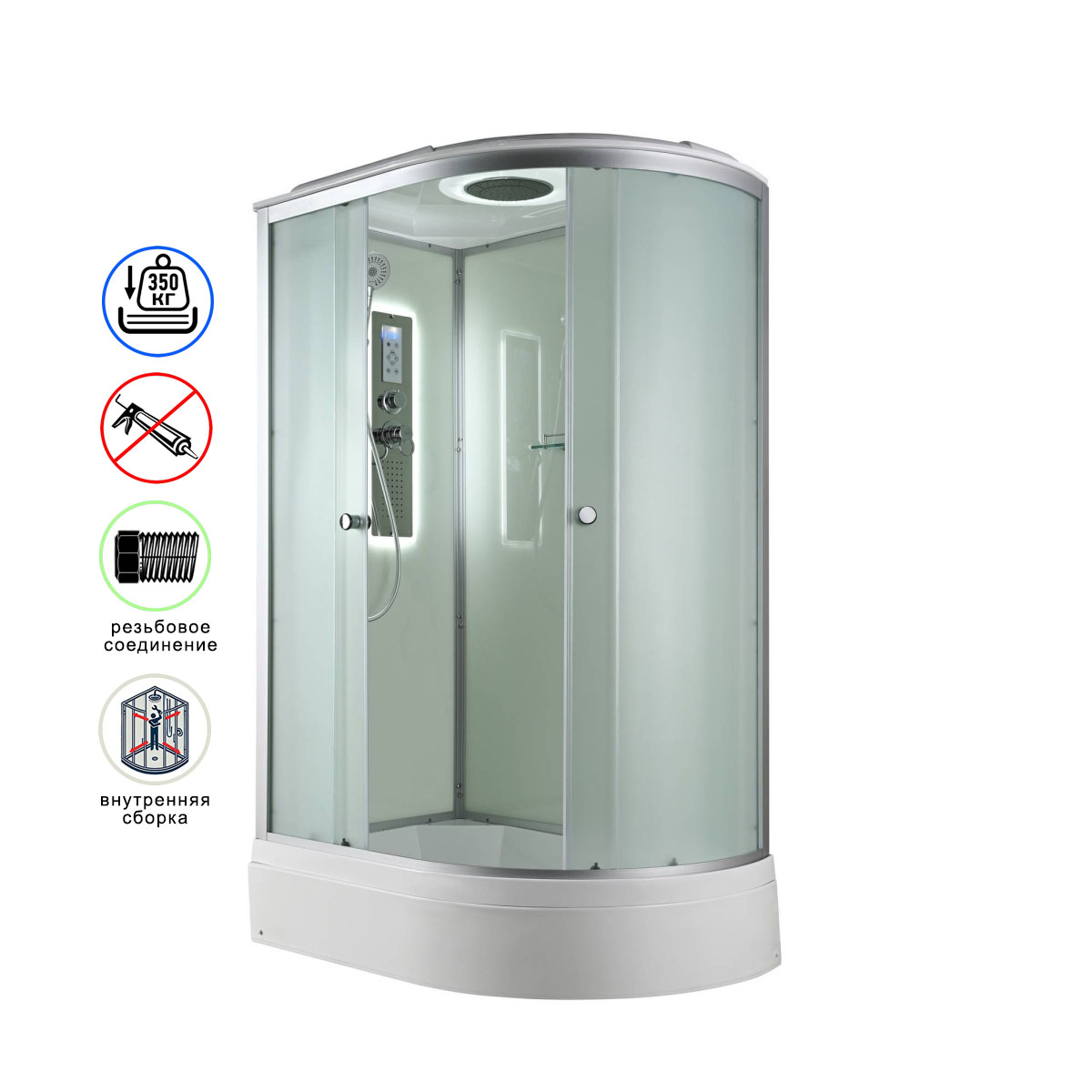 Стильная душевая кабина AvaCan D 3012L LED сочетает в себе высокую функциональность, практичность и надежность. При изготовлении применяется безопасное закаленное стекло толщиной 4 мм (матовое), надежно фиксируемое алюминиевым профилем. Сборка без силикона (увеличивает срок службы), внутренняя сборка(облегчает установку и ревизию; позволяет установить в ограниченном пространстве), смеситель резьбовой (без хомутов). Съемный экран поддона (позволяет осуществлять ревизию сифона). Цвет профиля матовый хром. Двойные металлические ролики дверей (увеличивают срок службы).В комплекте : душевая штанга, полочка, тропический (верхний) душ, арома-лейка с витамином С (картридж съемный), сенсорный пульт (блютуз, радио, LED подсветка в крыше и в центральной панели, вентелятор.)