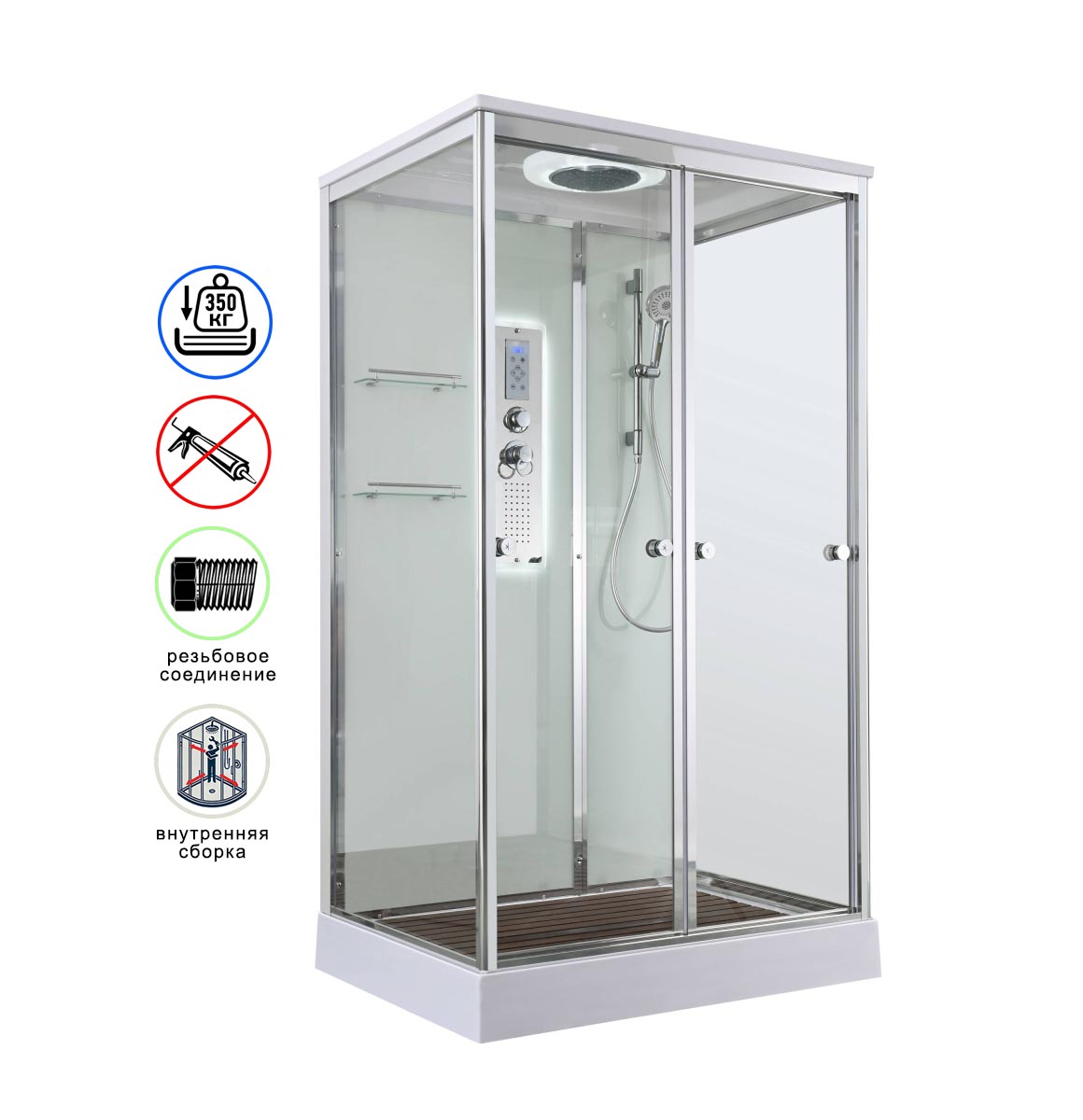 Стильная душевая кабина AvaCan сочетает в себе высокую функциональность, практичность и надежность. При изготовлении применяется безопасное закаленное стекло, надежно фиксируемое алюминиевым профилем.Профиль сделан из алюминия повышенной прочности. Сборка без силикона (увеличивает срок службы, защищает от протечек), внутренняя сборка (облегчает установку и ревизию; позволяет установить в ограниченном пространстве и обойтись без демонтажа других сантехнических приборов), смеситель резьбовой (без хомутов).Двойные металлические ролики дверей (распределение нагрузки на два ролика, увеличивают срок службы). Душевая штанга(позволяет регулировать по высоте ручную лейку), ручная арома-лейка с витамином С (картридж в комплекте, есть возможность замены или удаления картриджа), полочки(из стекла, с ограничителем), сифон с гидрозатвором, сенсорный пульт управления с функциями: блютуз, LED подсветка, радио, вытяжка, гидромассаж спины, тропический (верхний) душ.