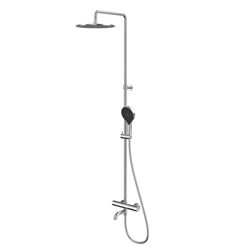 Верхний душ диаметром 300 мм из элегантной латуни дарит ощущение простора и релакса, а поворотный кронштейн с регулировкой высоты от 960 до 1500 мм позволяет идеально подстроить его под любого пользователя. Излив длиной 200 мм обеспечивает удобство при наполнении ванны, дополняемый гибким душевым шлангом в 150 см для максимальной свободы движений.