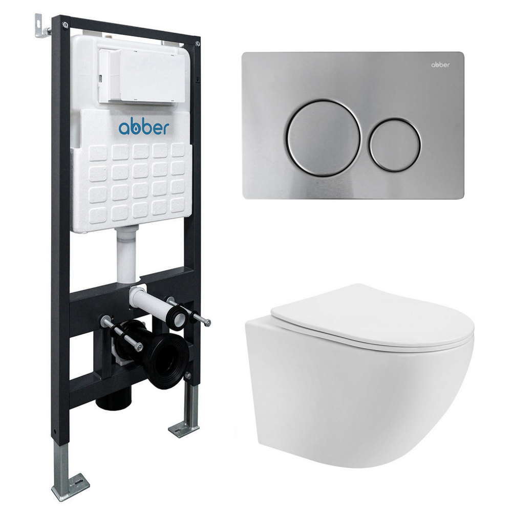 Комплект инсталляции Abber AC0105 с клавишей смыва AC0121MCH хром матовый и подвесным унитазом Bequem AC1100T