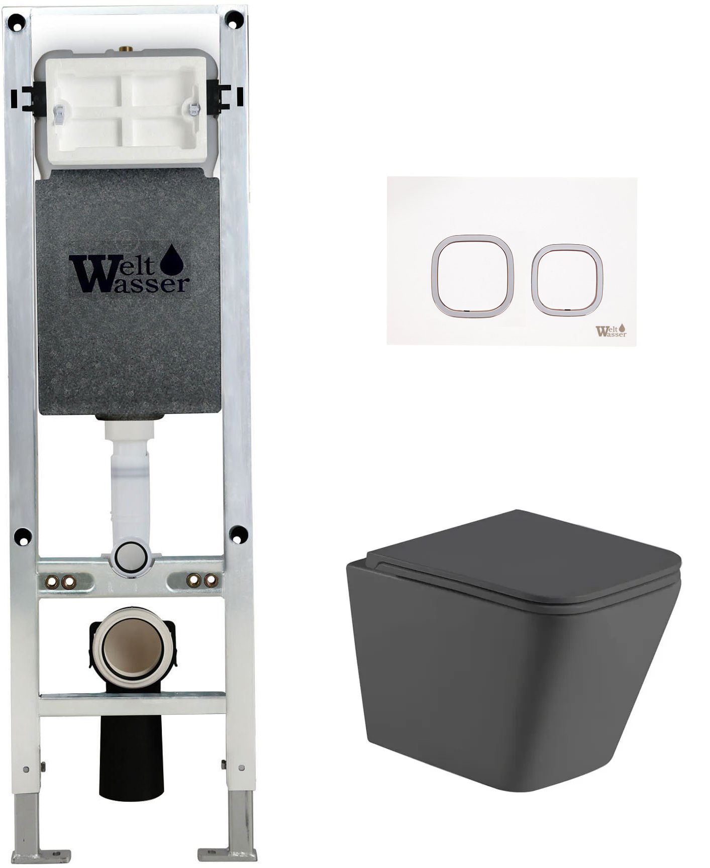 Комплект инсталляции Welt-Wasser AMBERG 350 ST с клавишей смыва AMBERG RD-WT и унитазом GELBACH 043 MT-GR