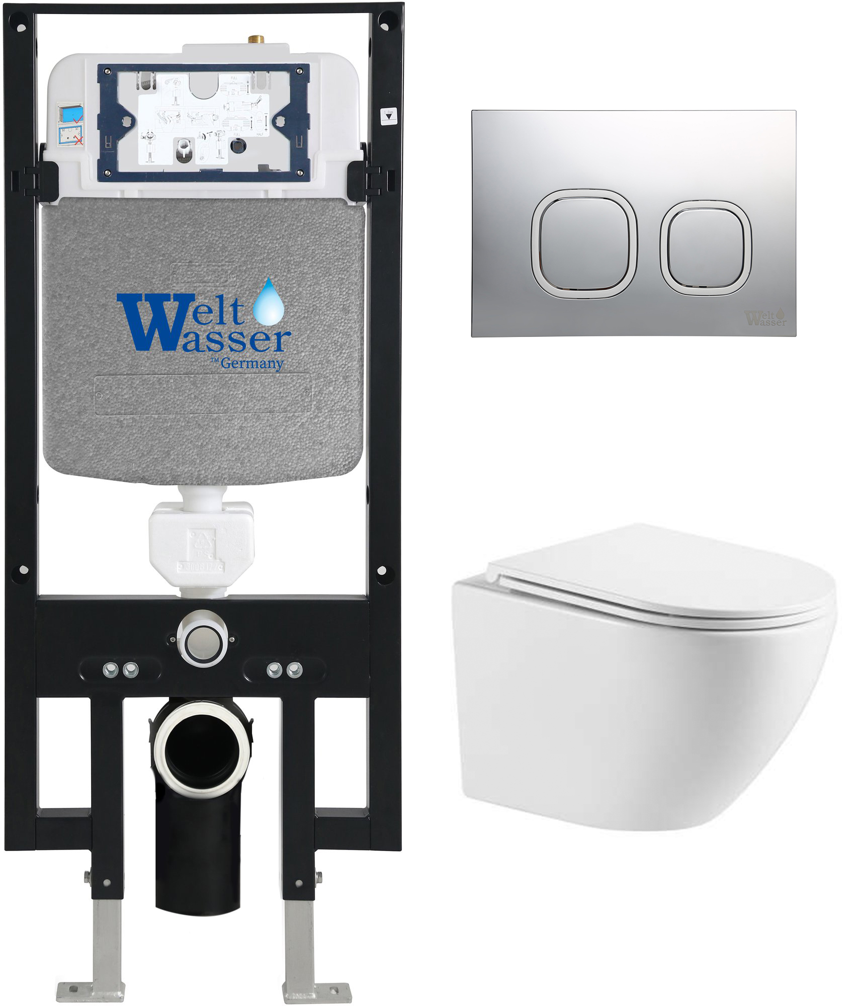 Комплект инсталляции Welt-Wasser AMBERG 497 с унитазом MERZBACH 043 XL GL-WT и клавишей смыва AMBERG RD-MT CR хром матовый