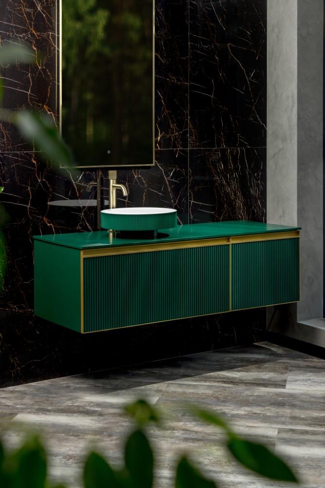 Столешницы делают из природного средиземноморского мрамора или запатентованного материала Solid Glass, состоящего из мраморной крошки и стекла.