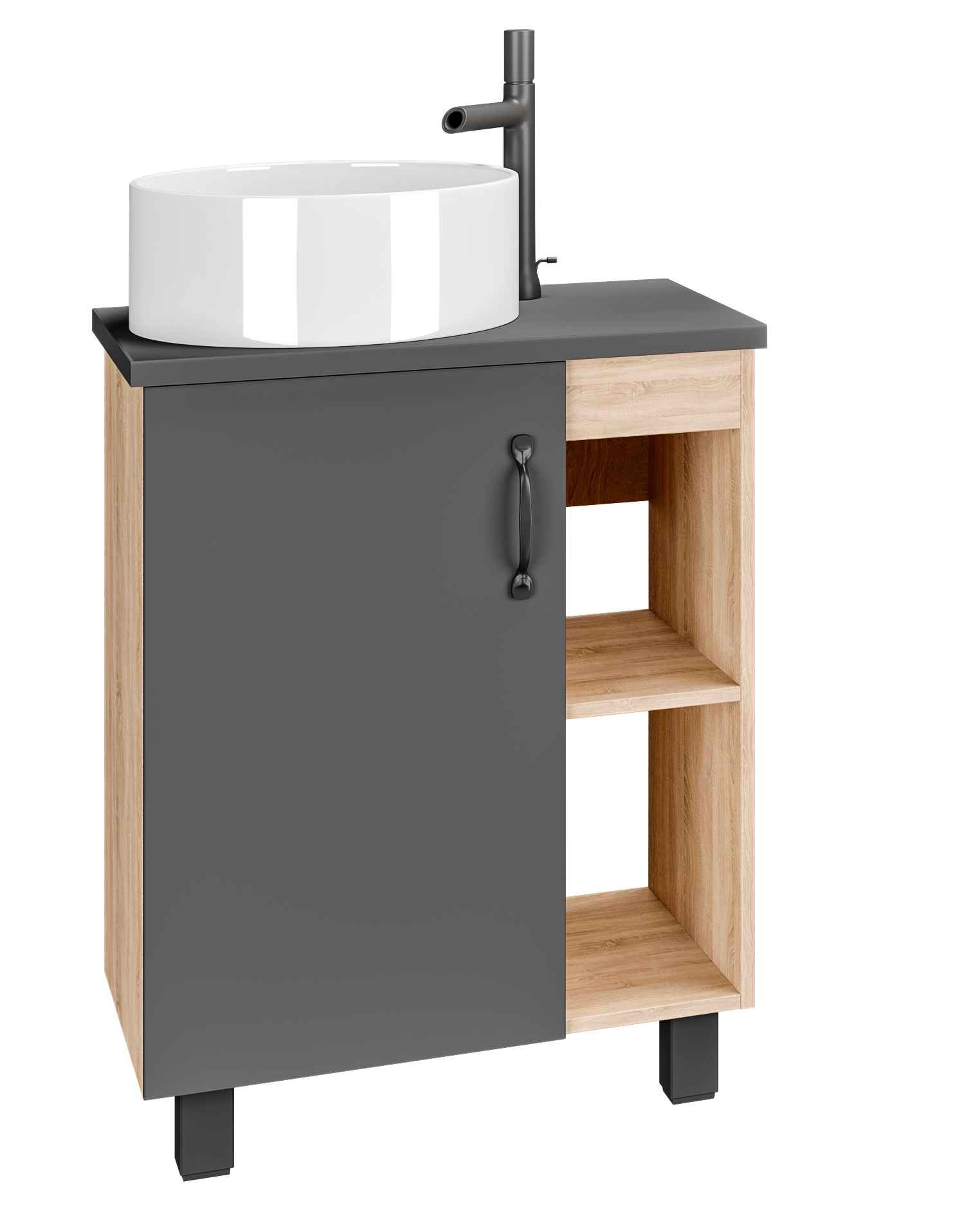В тумбе Флай сочетаются контрастные цвета и фактуры: серый матовый фасад с покрытием SoftTouch, корпус цвета дуба с текстурой, черная матовая фурнитура