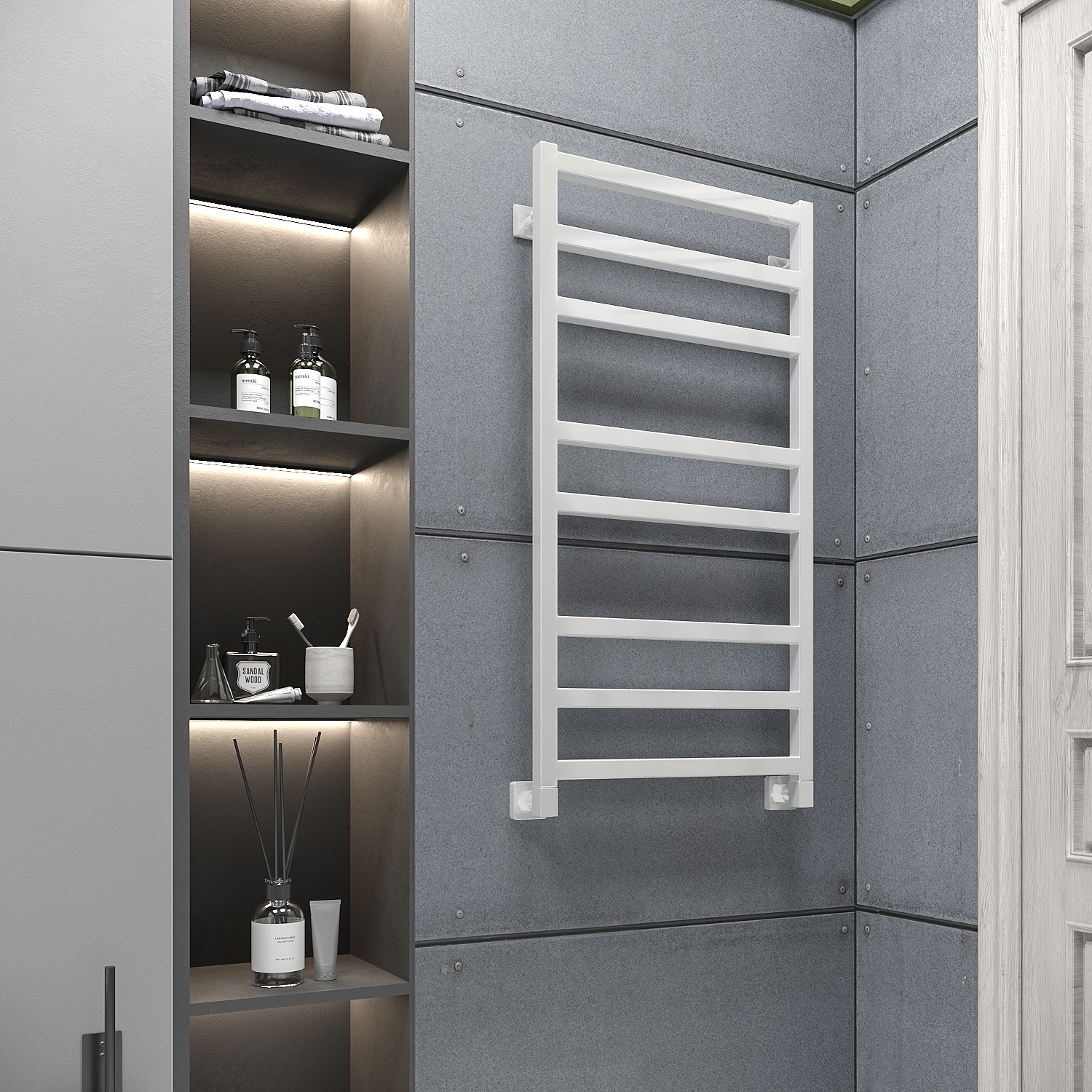- Скрытое подключение дает возможность подключить электрический полотенцесушитель без видимых проводов