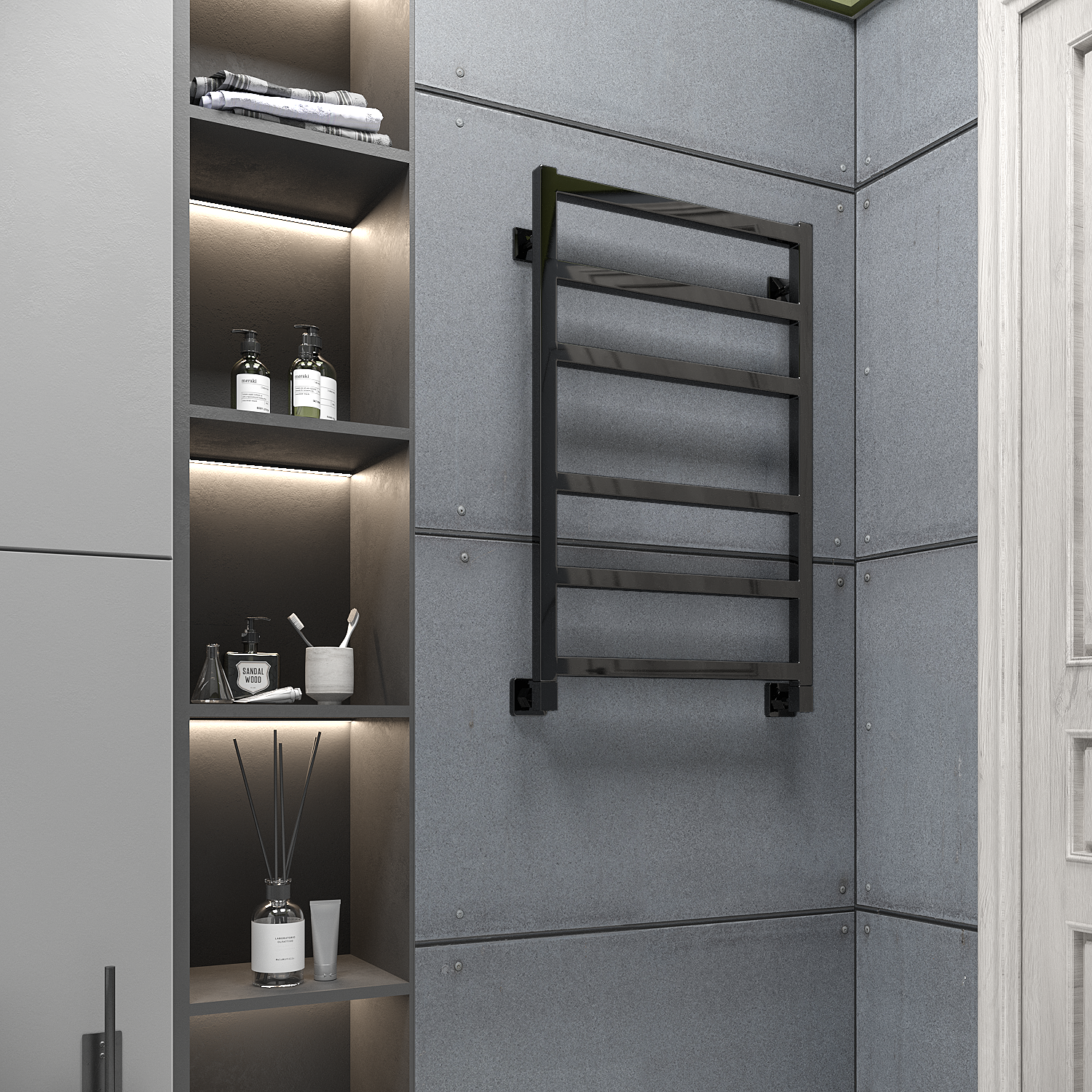 - Скрытое подключение дает возможность подключить электрический полотенцесушитель без видимых проводов