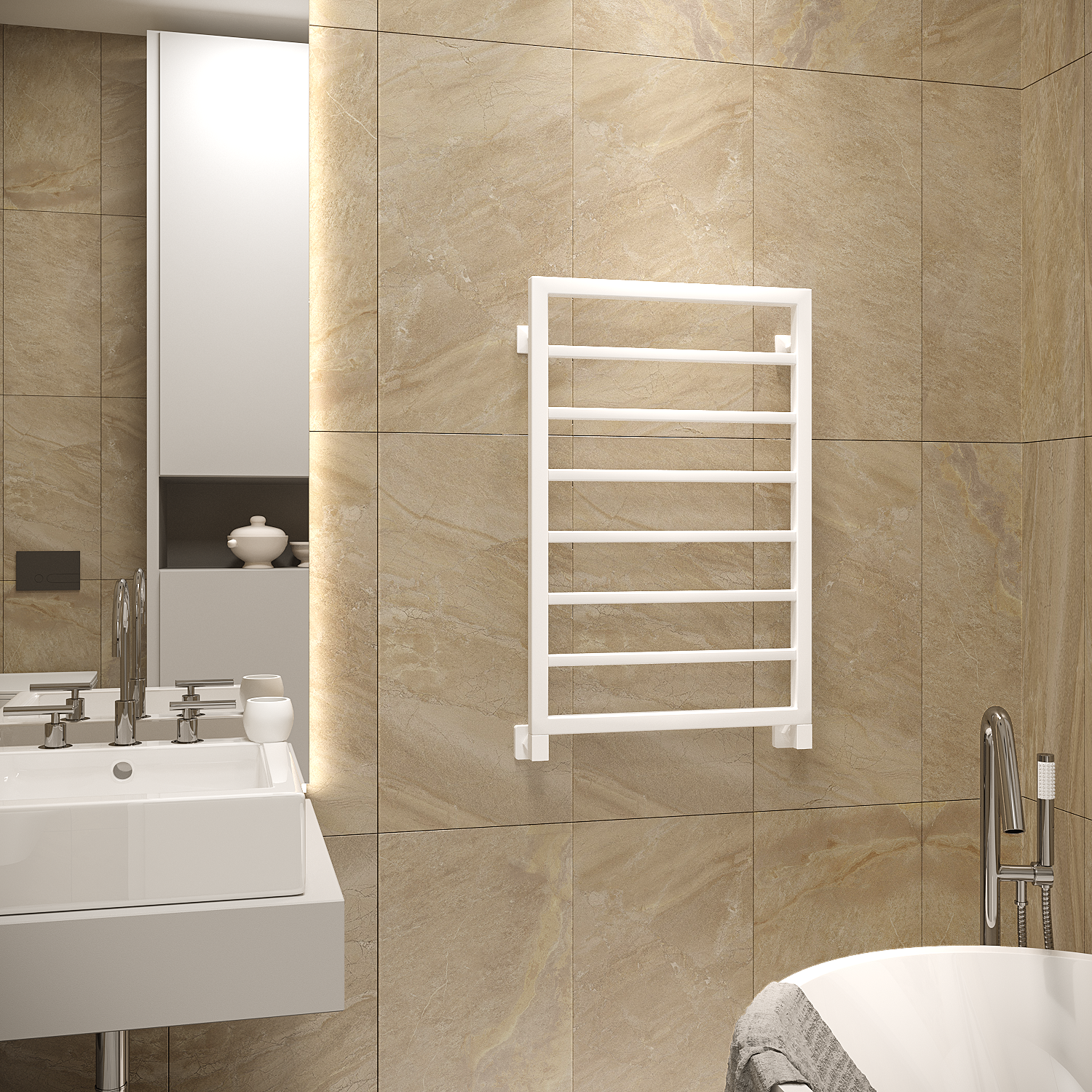 - Скрытое подключение дает возможность подключить электрический полотенцесушитель без видимых проводов