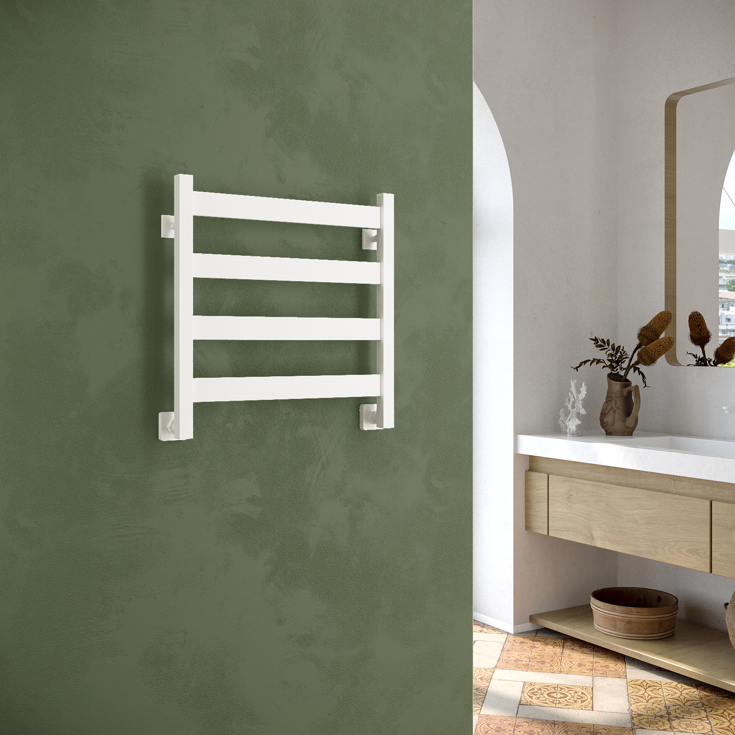 - Скрытое подключение дает возможность подключить электрический полотенцесушитель без видимых проводов