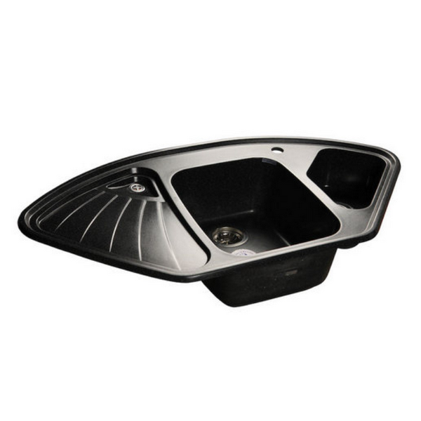 Мойка из искусственного камня, врезная, угловая двухсекционная. Практичная и функциональная модель, имеет удобное крыло со сливным отверстием и дополнительную чашу.
