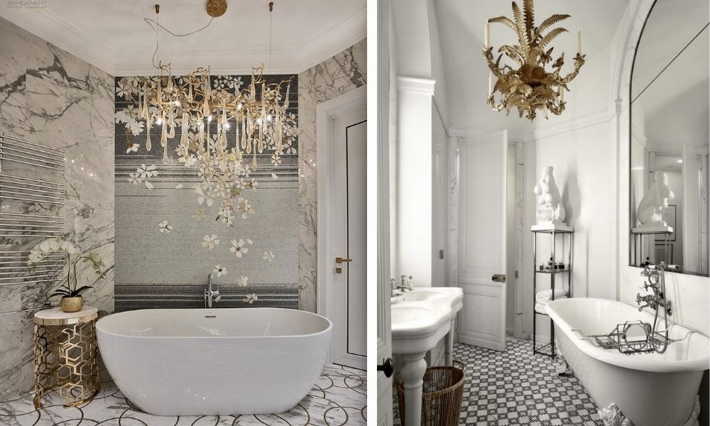 Здесь также не стоит забывать о мере: слишком много сияния не украсит санузел, поэтому лучше использовать что-то одно.