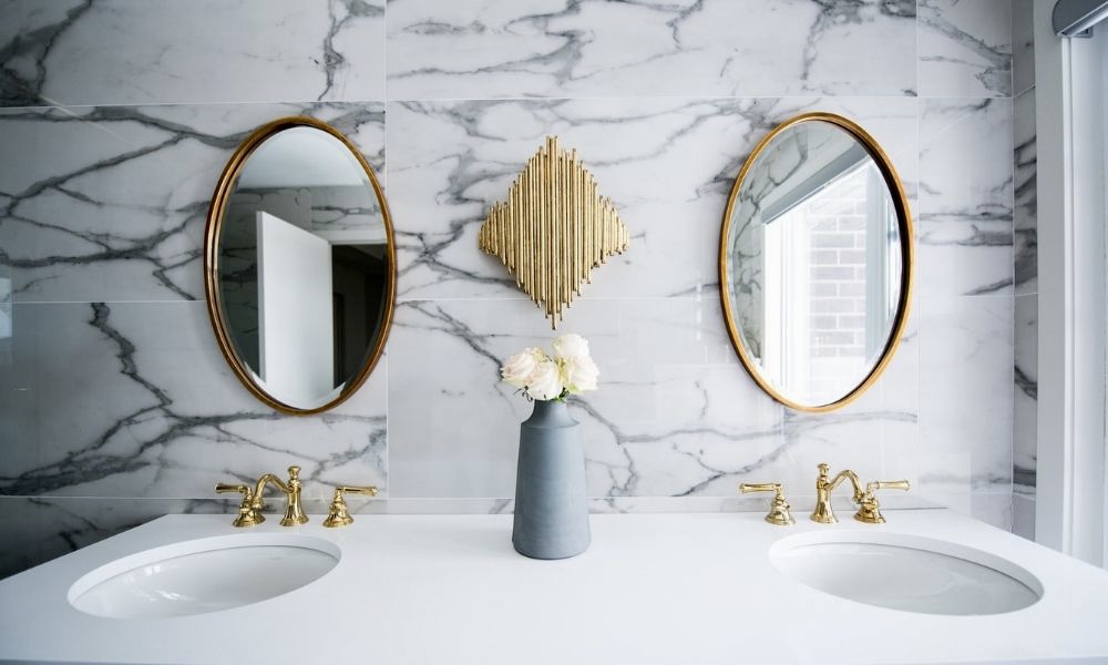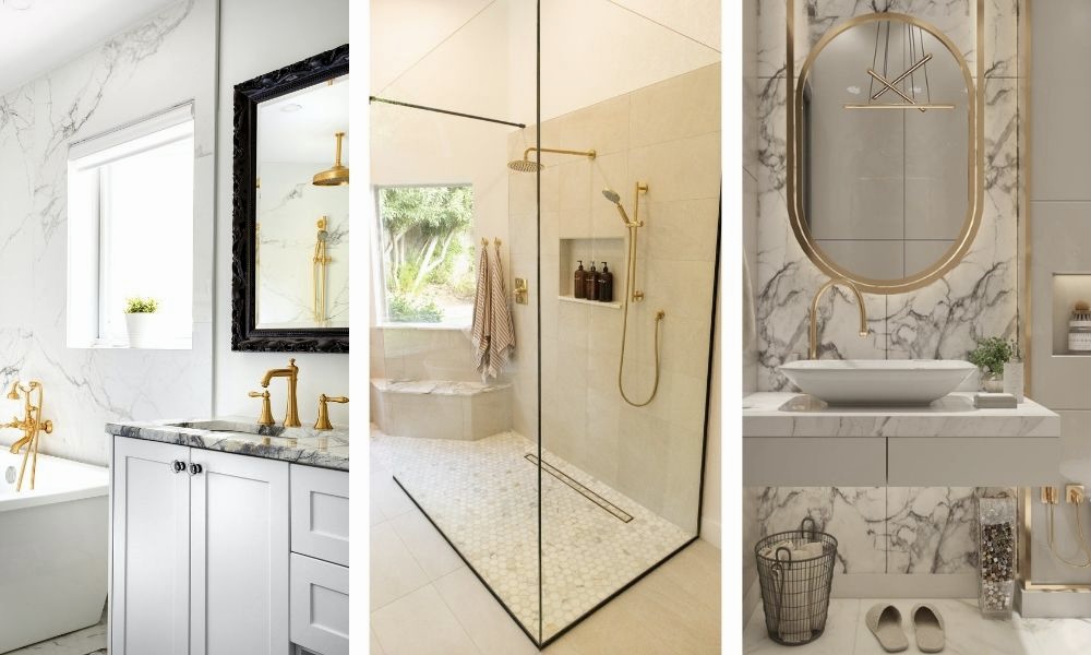 Если ваша цель — лишь немного добавить красивых акцентов в помещении, то смело используйте декор в золотом цвете. Это может быть позолоченная рама на зеркале, дверные ручки, держатели для бумаги, полотенец и щёток. Золотые смесители на ванне или раковине добавят шика богемного бохо стиля или ретро утонченности.