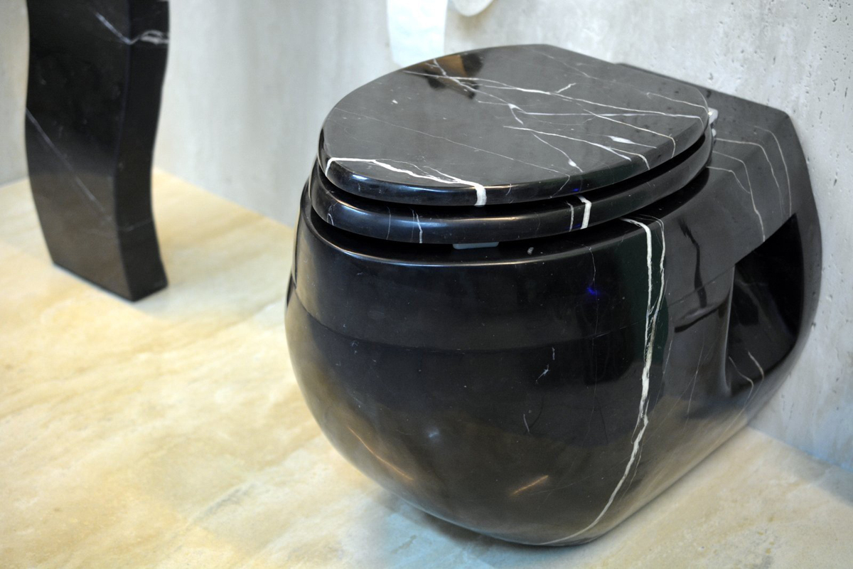Унитазы из камня дорого стоят и много весят. Чтобы отчасти сократить затраты, люди приобретают сантехнику из искусственного камня. Ее стоимость меньше, чем у аналогов из мрамора, а смотрится она также экстравагантно и дорого. Дороговизна – главный минус каменных унитазов, сокращающий аудиторию пользователей. Такие обычно встречаются в богатых особняках и дорого обставленных квартирах, оформленных в едином, чаще классическом, стиле.