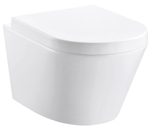 Белый фарфоровый унитаз с горизонтальным выпуском и эстетичным сиденьем из дюропласта, с закругленной воронкой. Для современных интерьеров. Настенное крепление.