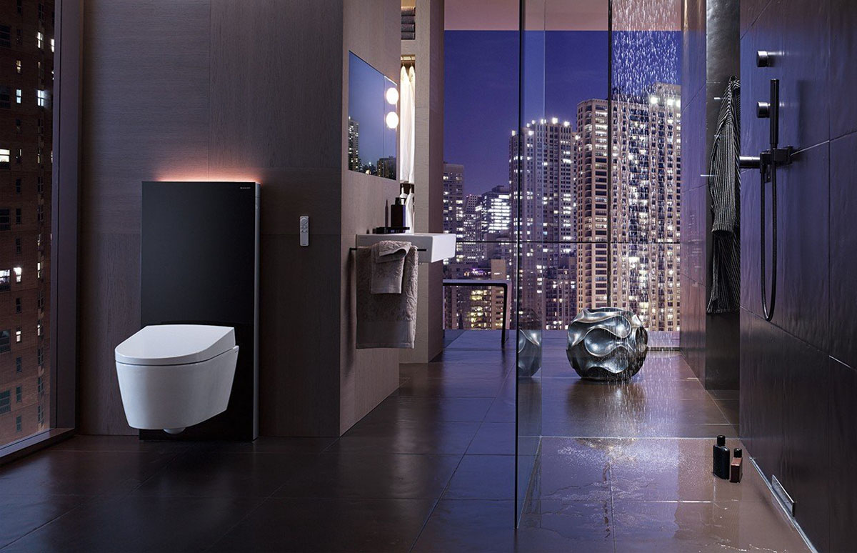 - Умные унитазы от швейцарской фабрики Geberit с функцией биде, электрическим шнуром, освежителем воздуха, сушкой и другими опциями.