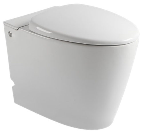 Приставной унитаз с воронкообразной чашей закругленной формы. Выполнен в современном стиле Hi-Tech из прочного