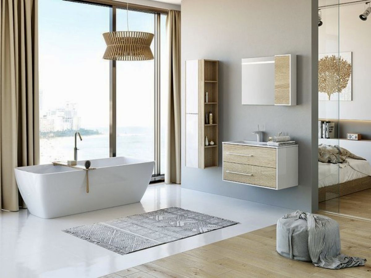 Ввиду простоты концепции всего помещения, мебель для ванной выбирается под стать: максимально удобная и простая. Покрытие может быть матовым. Подходящие мебельные наборы включают в себя напольные, подвесные или встроенные шкафы. Для установки можно также использовать место под раковиной или над унитазом.