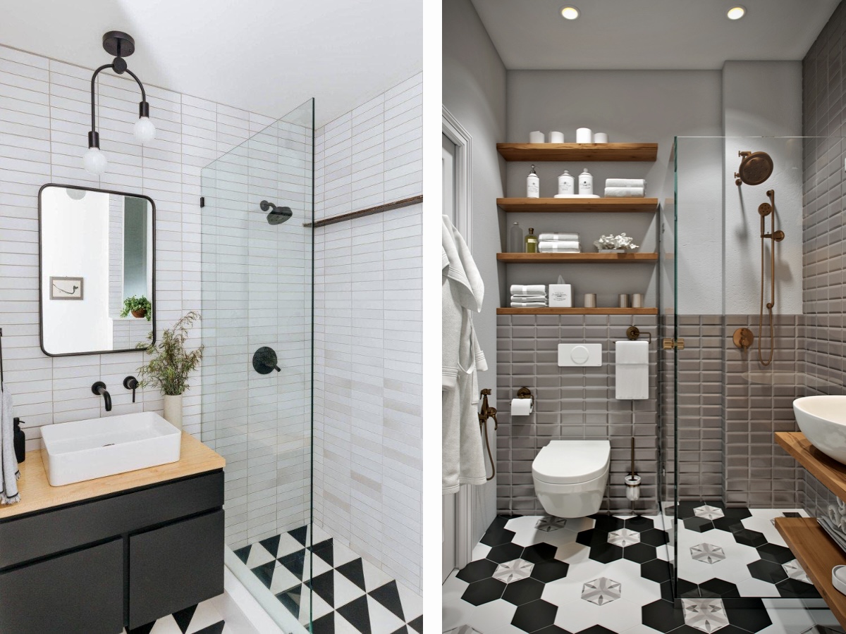 Если вы приверженец душа и не собираетесь подолгу наслаждаться спа-процедурами в ванне, то можно выбрать современные модели встроенных душевых кабин. Ещё более гармоничный вариант — душевой уголок или walk-in. Минимум декора и использование стекла сделает помещение ещё более светлым и лёгким. Такой же эффект подчеркнут и подвесная сантехника: раковина или унитаз.