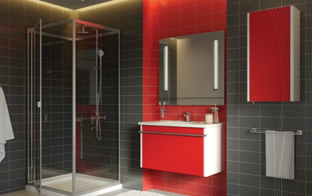 Комплект для ванной от бренда «Аква-Родос» представленный выше отлично смотрится в ванной с контрастным интерьером. Красное покрытие шкафчиков и тумб подойдет для темного и даже черного кафеля. В данный гарнитур входит зеркало со встроенным шкафчиком, подвесной шкаф для гигиенических принадлежностей и подвесная тумба под раковину с дополнительными пространством внизу. Такой комплект удобен при уборке, так как шкафчик расположен на значительном удалении от пола. Все фасады выполнены из МДФ, устойчивого к перепадам температуры. Что касается покрытия, то все части мебели имеют три слоя грунта, который создан при использовании итальянской влагоустойчивой краски. Все ящики имеют доводчики, а дверца амортизаторы.