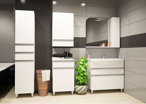 Белая мебель стильно смотрится, если вы используете контрастную плитку. Мебельный гарнитур состоит из шкафа-пенала с двумя отделениями, тумбы под умывальник, дополнительной тумбы для гигиенических принадлежностей, и зеркала, совмещенного с подвесным шкафчиком. Стоит отметить, что этот комплект мебели для ванной комнаты очень вместительный, и при этом довольно компактный. Дополнительная тумба расположена вплотную к умывальнику, это экономит место, и позволяет хранить в ванной больше полезных вещей. Тумба под умывальник может быть как подвесной, так и на ножках, которые дополнительно входят в комплект. Фасад мебели выполнен из МДВ с двухсторонней ламинацией. Все внешние фасады покрывают влагоустойчивой краской и максимальной степенью блеска.