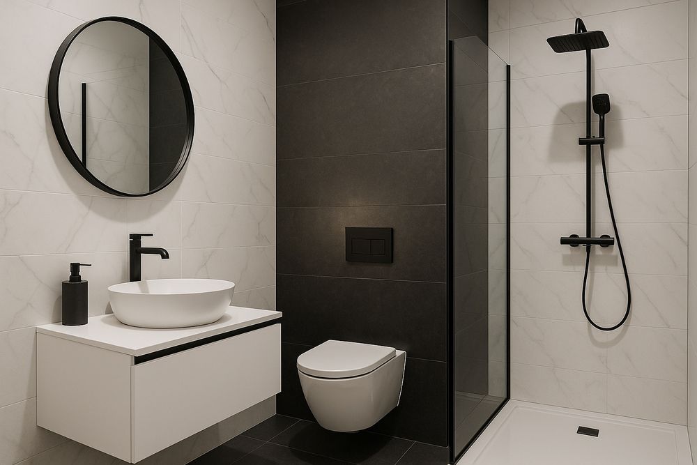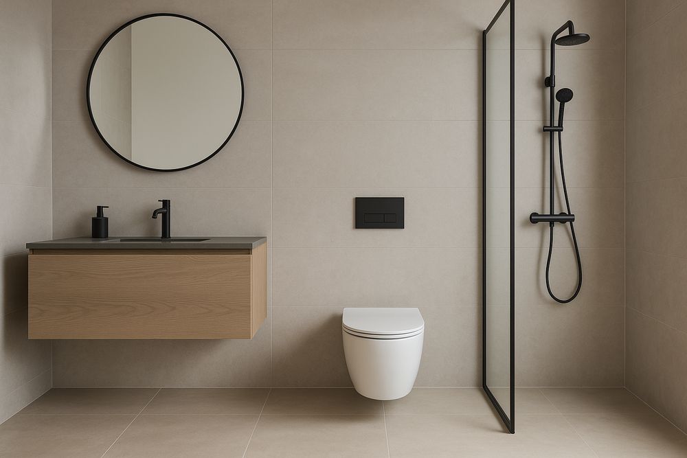 Минимализм никуда не уходит, но в 2025 году он становится более «живым». Простые формы, чистые линии и нейтральные цвета дополняются акцентными элементами — чёрными смесителями, контрастной фурнитурой, дизайнерскими зеркалами.